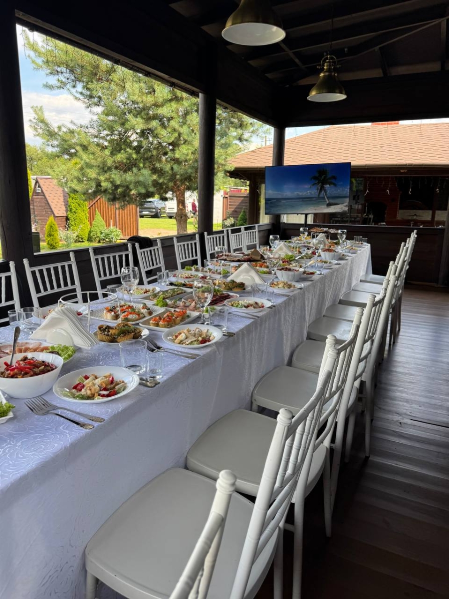 Предоставляем: Обустроенную просторная территория Гостевой дом с возможностью ночлега для 43 человек Комфортные спальные комнаты, одна из них с выходом на лоджию Банкетный зал для торжеств Финскую сауну Беседка с русской печкой и барбекю зоной Мангал Круглые и прямоугольные столы на выбор, текстиль (скатерти и салфетки), белые итальянские стулья Chiavari Организационные возможности в усадьбе: Вы можете заказать трех разовое питание либо банкет, наши повара учтут Ваши пожелания и приготовят вкусные и изысканные блюда. Для проведения свадеб, банкетов и корпоративов в усадьбе есть команда поваров и официантов.