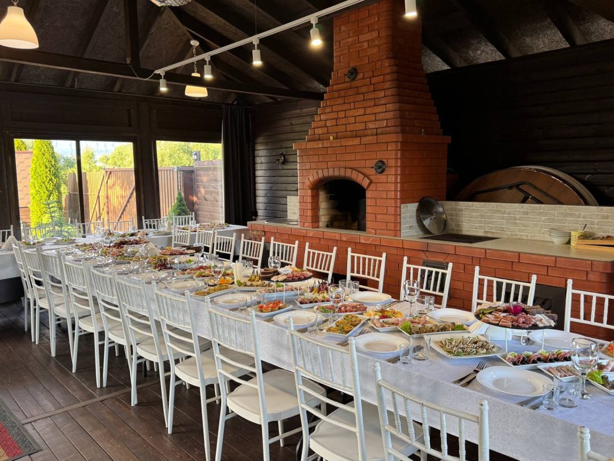 В зале продумано все для Вашей идеальной свадьбы: стильный интерьер, система кондиционирования, продуманное освещение. Так же гостям предлагается гостевой дом, вместимостью до 43человек. Дом оснащен современной кухней, финской сауной, где под воздействием сухого горячего пара ваше тело начнет расслабляться, а самочувствие мгновенно улучшится. И, конечно же, изюминкой является беседка вместимостью до 35 человек, с её неповторимой русской печкой и барбекю зоной. В тёплое время года – это прекрасное место для проведения небольших банкетов и встреч с друзьями.